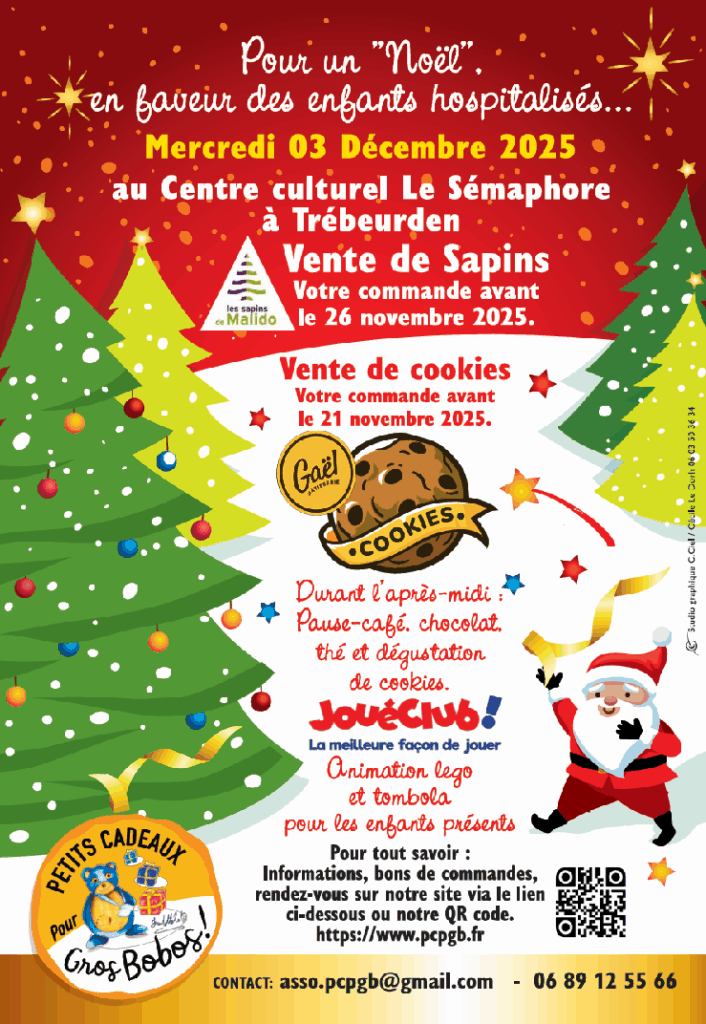 Vous pourrez également récupérer votre sapin auprès de la menuiserie Saliou à Saint-Quay Perros les 4 et 5 décembre en journée. Dans ce cas, il est « impératif » de contacter notre association par téléphone au moment de votre commande.