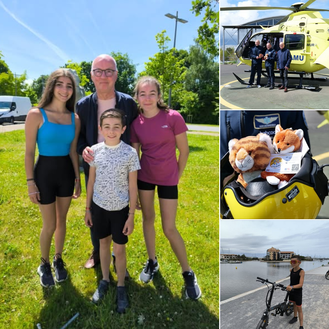 - Au mois d’avril, une rencontre avec l’équipage de l’hélicoptère du SAMU 22 à Saint-Brieuc et la remise de 85 doudous et peluches pour les enfants héliportés.